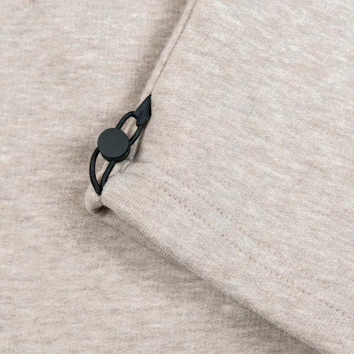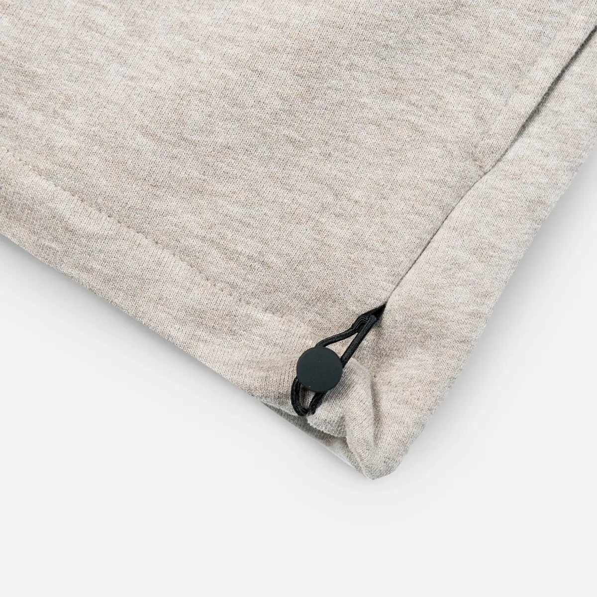 Состав худи — 90% хлопок и 10% полиэстер — обеспечивает идеальный баланс между мягкостью, дышащими свойствами и долговечностью. Такой микс материалов гарантирует, что вещь не сядет после стирки и сохранит свою форму даже при активной носке. Технология обработки ткани OVSZD (Optimal Visual Structure & Durability) придает материалу повышенную износостойкость и устойчивость к деформациям. Нежный бежевый меланжевый оттенок легко комбинируется с любой обувью из твоей коллекции — от классических белых кроссовок до ярких моделей.